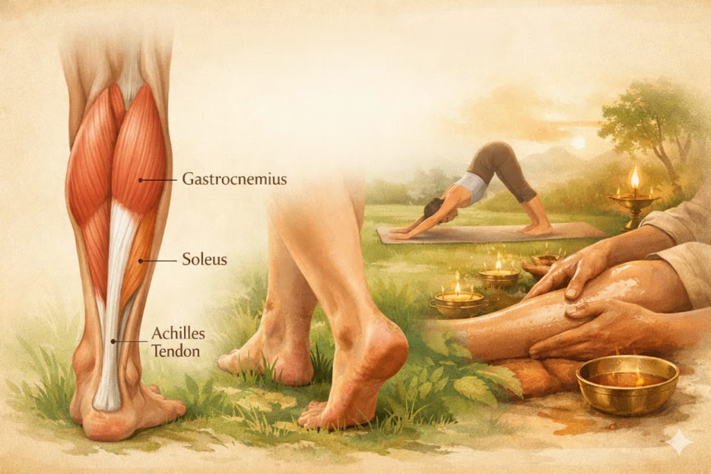 Regular calf massage improves circulation, relieves tightness, and supports muscle recovery. Ayurvedic therapies often use warm oils to nourish deeper tissues.