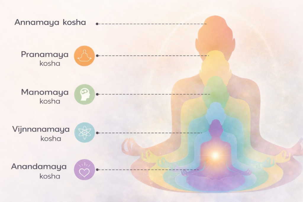 In yogic philosophy, a human being is not seen as just a physical body. According to ancient yogic texts like the Taittiriya Upanishad, we are made up of five layers or sheaths, known as Pancha Kosha (Pancha = five, Kosha = sheath or covering).